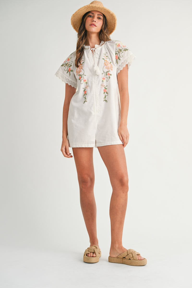 Floral embroidery short sleeve with lace trim romper with front tassel self tie detail. Lining.